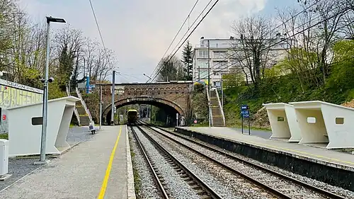 Boondael railway station (French: Gare de Boondael) or Boondaal railway station (Dutch: Station Boondaal)[a] is a railway station in the municipality of Ixelles in Brussels, Belgium, operated by the National Railway Company of Belgium (NMBS/SNCB). The station lies on line 26, between Delta and Vivier d'Oie railway stations, respectively in Auderghem and Uccle.