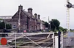 The signal box built circa 1874 is a Furness Railway Type 1 design and was listed in November 2013 for its historic interest as one of the earliest surviving signal boxes in England and in the best original condition of the two of this type remaining. Its lower structure is built of red sandstone dressed with rock-faced ashlar and its roof is of Welsh slate. Inside it retains a London Midland Region lever frame of 15 levers installed in 1977.[12] In November 2024 plans were announced for its restoration.[13]