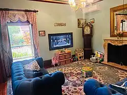 At ground floor level, the original main core of the house is made up of four rooms, a central hallway and a staircase. Large double bi-parting doors separate two of the main rooms ( original dining and drawing rooms). The hallway leads to an original lavatory box room and cellar. a doorway from the original dining room leads to the original detached kitchen wing and service entry, and subsequent 1896 attached kitchen and rear access. There are three fireplaces, one with marbled paintwork on timber. The chimneys for these fireplaces were closed up, with all cleaned and two reopened during the conservation.[1]