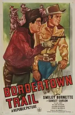 Bordertown Trail is a 1944 American Western film directed by Lesley Selander and written by Robert Creighton Williams and Jesse Duffy. The film stars Smiley Burnette, Sunset Carson, Weldon Heyburn, Addison Richards, Francis McDonald and Jack Luden. The film was released on August 11, 1944, by Republic Pictures.[1][2][3]