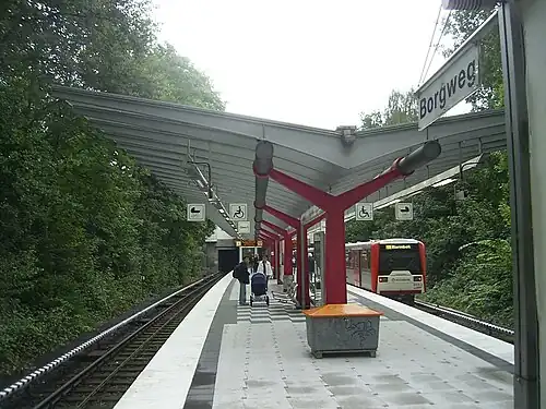 Borgweg is a rapid transit station on the Hamburg U-Bahn line U3. The station was opened in May 1912 and is located in the Hamburg district of Winterhude, Germany. Winterhude is part of the borough of Hamburg-Nord.
