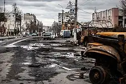 During the 2022 Russian invasion of Ukraine, Borodianka was on the main axis of the Russian advance on Kyiv launched on 24 February 2022 and it came under heavy Russian air strikes and artillery shelling early in the war's 2022 campaign.[6][7][8] Several apartment buildings and other civilian infrastructure were destroyed.[9] Russian troops blew up bridges and blockaded the area — leaving survivors to starve as supplies couldn't reach the town.[10] Russian soldiers looted shops and residences.