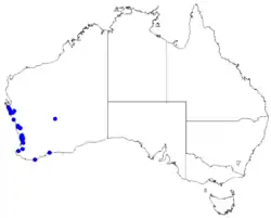 Winter boronia grows in swampy areas and on coastal plains and rock outcrops. Subspecies purdieana is found near the west coast between the northern suburbs of Perth and Shark Bay with a disjunct population near Leonora. Subspecies calcicola occurs between Kalbarri National Park and Shark Bay.[8][9][11]
