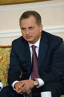 Borys Viktorovych Kolesnikov (Ukrainian: Борис Вікторович Колесніков, born 25 October 1962)[5] is the leader of the political party Ukraine is Our Home.[6][8] He is the former secretary of the Party of Regions' presidium, former people's deputy in Verkhovna Rada (Ukraine's national parliament) and head of the Verkhovna Rada Committee on Transport and Communications, and former deputy prime minister of Ukraine and former Minister of Infrastructure of Ukraine.[3] He is the owner and president of the HC Donbass ice hockey club.