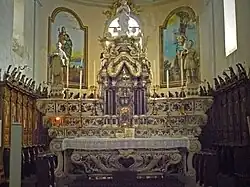 The archway leading to the presbytery is narrower than the nave and flanked by two pilasters. The presbytery itself, which is very deep, is covered by an octagonal cupola (planned in the opening years of the 19th century by the architect Domenico Franco) and finished by a semi-circular apse, separated from the nave by a marble balustrade. Three steps lead to the presbytery; at the foot of the central stair are two marble lions. The high altar is also of marble of the 17th century, crowned by statues of Our Lady of the Immaculate Conception and of Saints Emilius and Priamus, patrons of the town. To either side of the altar are the inlaid wooden choir stalls. The frescos are by the Parma artist Emilio Scherer, between 1877 and 1878.