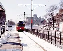 The station has the third-highest ridership on the B branch (after only Harvard Avenue and Packards Corner).[4] In the early 2000s, the MBTA modified key surface stops with raised platforms for accessibility. Portable lifts were installed at Boston University Central around 2000 as a temporary measure.[5][6] Construction at Boston University Central and Boston University East was part of a $32 million modification of thirteen B, C, and E branch stations.[7] During construction, an interim station with temporary platforms between the two stops was used.[2] Construction began on March 18, 2002, a week behind schedule due to delays in finishing up similar work at Harvard Avenue and Washington Street. The project was then expected to be completed within six months.[2]