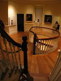 The city of Boston still owns the structure, and it is within the Boston National Historical Park and a major site on the Freedom Trail, but day-to-day management of the site was in the hands of the Bostonian Society,[1] which maintained a museum in the building and a research library across the street.[9] Materials in the collection date back to 1630s Massachusetts Bay Colony and include 7,500 books, 350 maps, 30,000 photographs, and other primary source materials.[10] Exhibits at the museum focus on the American Revolution and the American Revolutionary War, the neighborhoods of Boston, and similar local themes.[2][5][6] Some of the artifacts on display on the walls and in glass cases are antique rifles and other weapons, old nautical instruments from the Age of Sail, images from 18th century London newspapers expressing how Britons viewed the war, and an original Paul Revere political cartoon that was passed down through the family of Josiah Quincy I until it was donated it to the Bostonian Society in the 1880s. There is also a model showing what Boston looked like during Colonial America.