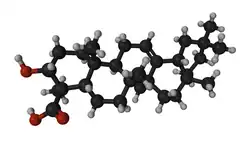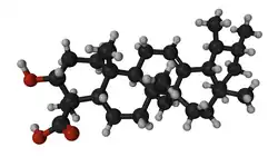 Acetyl-boswellic acids also exhibit anti-inflammatory behaviour by inhibiting leukotriene synthesis.[6] It inhibits the activity of the enzyme 5-lipoxygenase through a non-redox reaction. Specifically the 3-acetyl-11-keto-beta-boswellic acid binds as an allosteric partial inhibitor, initiating a shift in regioselectivity of the catalyzed reaction.[7] Clinical trials[8][9] have investigated the effectiveness of boswellic acids in treating ulcerative colitis, but a study on chemically induced colitis in mouse models[10] showed little effectiveness. A later study showed that low doses of Boswellia serrata extract may have hepatoprotective effects. The higher dose was found to have a milder hepatoprotective effect than the lower dose.[11]