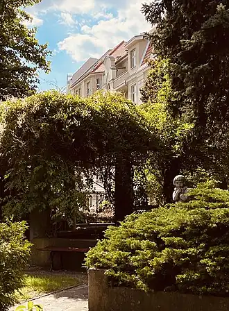 In 1979, the sculptor Stanisław Horno-Popławski moved to a small house in the Botanic Garden, which he used as a studio. On July 22 of this year, then the official holiday in the Polish People's Republic, Horno-Popławski opened in the garden permanent outdoor exhibition of his compositions, which he donated to the city. Called Stone Stream (Polish: Potok Kamienny), the collection included the following works: "Partisan", "Memories of Bagrati", "Morena", "Copernicus", "Tadeusz Breyer", "Tehura", "Gruzinka", "Waiting", "Szota Rustawelli", "Colchida" , "Żal", "Pogodna", "Beethoven" and "Hair".[9] These artworks are now incorporated into the rich vegetation of the Garden, giving it a poetic look.[3]