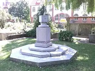 Among the built structures, one can notice stone arches, pergolas, and a small courtyard showing on its centre a sundial, with four stone sculptures (1.5 metres (4.9 ft) tall) standing in corners, portraying the seasons. This allegoric ensemble, called The four parts of the year, was in the initial 1930's botanic garden lay out, offered by Polish sculptor Bronisław Kłobucki (1896-1944).[7] They have been lost, together with the sundial, when the new botanic garden at Myślęcinek opened in 1979. Thanks to sponsoring efforts (Ewa Taterczynska Foundation and Bydgoszcz Pomeranian Gas Company), the decorative courtyard has been restored to its original shape and location. Stone figures Autumn (Polish: Jesień) and Winter (Polish: Zima) have been realized by Stanisław Radwański from Gdańsk and set back in the arboretum in mid-May 2008 and on March 22, 2010. Last two sculptures, also by Stanisław Radwański, have been placed back to the garden on September 18, 2014 (Spring - Polish: Wiosna), and on October 17, 2015, (Summer - Polish: Lato).[8] In addition, the lost sundial has been replicated by Richard Lewandowski.