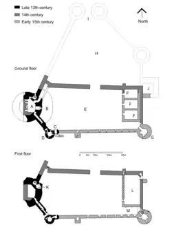 The huge cylindrical donjon was built in the 13th century, but before the rest of the castle was completed it was severely damaged in a series of sieges. Rebuilding in the early 15th century enlarged the castle, but it was abandoned by the 18th century. The present ruin is rectangular, with the remains of the donjon to the west, and the later Great Hall to the east. The courtyard is enclosed by long curtain walls, with round towers at the south-east and south-west corners. The castle was described by Scottish archaeologist William Douglas Simpson as one of the "foremost secular structures of the Middle Ages in Scotland".[1]