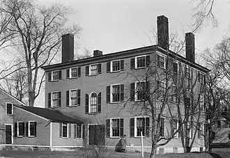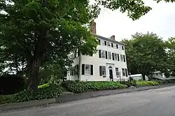 The Bourne Mansion is set on the west side of Bourne Street, in a small residential area north of United States Route 1 in the town center. It is a three-story wood-frame structure, with a low-pitch hip roof, clapboard siding, and a granite foundation. The main facade faces south, and is five bays wide, with a central entrance flanked by sidelight windows and Tuscan pilasters, and is topped by a fan-light window. Above this entrance is a Palladian window. There is a secondary entrance on the street-facing eastern facade, with Ionic pilasters supporting an entablature, with a fanlight just below. A single-story addition, built in the late 19th century, extends to the north. The interior has retained its elegant Federal finish, including a wide central hallway and a fine central spiral staircase. The side hall leading to the eastern entrance has a particularly fine carved arched niche for housing a tall clock.[2]