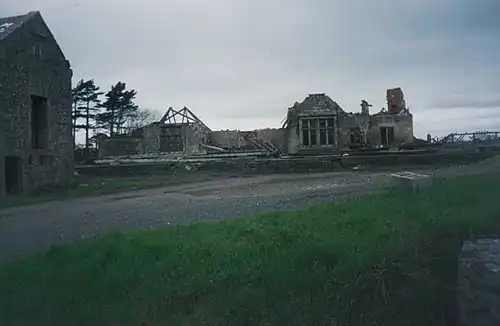 The station buildings are now (2023) in an extreme state of dereliction. A large farm shed covers a portion of the platforms and yard.