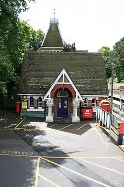 The station was constructed at the insistence of Thomas Grissell the owner of Norbury Park, in part compensation for the railway cutting across his land to the north of the village. The main building was designed by Charles Henry Driver[6] in the Châteauesque style and included steeply pitched roofs with patterned tiles and an ornamental turret topped with a decorative grille and weather vane.[7] The building is currently in use as a private dwelling and commercial premises and is protected by a Grade II listing.[1]