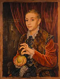 Boy with Apple is a 2012 painting by British artist Michael Taylor, and a fictional painting of the same name (attributed to the fictional "Johannes Van Hoytl the Younger") depicted in the 2014 Wes Anderson film The Grand Budapest Hotel, for which the work was commissioned as a prop. The portrait depicts a boy clad in Renaissance-style garb holding a green apple while pinching the stem.[1] Ed Munro, a dancer from London, was the model for the portrait.[2]