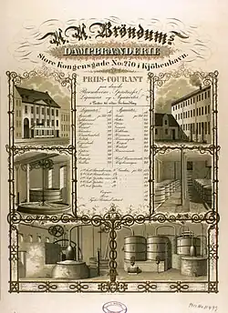 In 1842, Anders Antonsen Brøndum (1791–1861) purchased the property.[7] Anders Brøndum was the younger half-brother of Christen Brøndum. He had owned the distillery Paradis on Store Kongensgade from 1819 and was also the owner of the inns and associated distilleries Roskilde Kro (from 1838),[8] Store Kro in Kongens Lyngby and Bagsværd Kro in Bagsværd. He initially operated the property in Store Kongensgade as a brewery specializing in bavarian beer.[9] In 1844, Brøndum converted the brewery into a distillery and yeast factory.