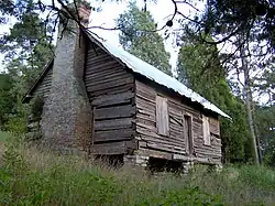 The Brabson plank house was built by either Andrew Evans or John Brabson sometime between 1790 and 1810. The plank house was constructed using an odd technique known as piece-sur-piece construction, which involves stacking horizontal planks and tying them in with vertical posts. In the 19th century, the plank house was moved from its original location and renovated for use as a carriage house. A large double-door was added to the front, and the chimney was removed.[5] A hewn log cabin, possibly built by John Brabson in the late 18th century, originally stood near the river but was moved to its present site near the cemetery in the 19th century.[12]