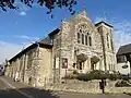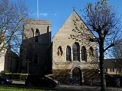 The oldest part of the Church of England parish church of Saint Peter at the eastern end of the town centre is an 11th-century Norman south doorway.[15] Both the four-bay arcade of the south aisle[16] and the west tower with its niches containing seated statues[15] were added in the 13th century. Next the chancel was rebuilt, probably late in the 13th century.[16] The north arcade and the windows in both the north and south aisles were probably added early in the 14th century, about the same time as the Decorated Gothic chapel was added to the chancel.[16]