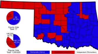 In the November 7 general election, Henry faced Fifth District U.S. Congressman Republican Ernest Istook and won with 66% of the vote.[2] He won with a higher total than any gubernatorial candidate in almost fifty years.[8] He only lost the three counties of the Panhandle, and won by large margins in a number of counties that normally vote Republican.