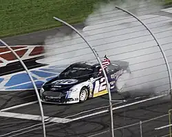 Keselowski pulled off a massive upset and earned his first career Sprint Cup victory in the Aaron's 499 at Talladega. He pushed Carl Edwards towards the front from fifth with two laps to go. Coming out of turn four on the final lap, he attempted to trick Edwards into blocking on the high side so that he could pull underneath. Edwards moved high to block, opening the door for Keselowski to attempt a pass on the low side. When he saw Keselowski moving low, Edwards again tried to block him. Their cars made contact, with Edwards spinning as Keselowski charged to the checkered flag. Due to the rear-wing design on 2009 Car of Tomorrow, Edwards' car lifted off of the ground as it spun backward.[10] After Ryan Newman's No. 39 hit Edwards' car, it sailed into the catch fence separating the track from the front grandstands, then skidded to a halt in the middle of the track. Eight fans were injured by flying debris; the most serious one being a woman who broke her jaw and was taken by helicopter to a nearby hospital. Keselowski earned his first career victory on his fifth career start and earned James Finch his first career victory as an owner in his twentieth year of racing. The race's final lap was the first Sprint Cup lap that Keselowski ever led, and therefore the only lap he led for the entire race; coincidentally this was the first time in history that the very first lap a Sprint Cup driver led was the final lap of a race.[11]