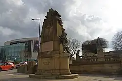 Bradford War Memorial commemorates the 37,000 men the English city of Bradford who served in the British Armed Forces in the First World War. Many of the 5,000 dead had served in the two Bradford Pals battalions and were killed on 1 July 1916, the first day of the First Battle of the Somme. The stone pylon with bronze statues was unveiled on 1 July 1922, in Victoria Square, beside Prince's Way, to the northeast of the Grade II listed Queen Victoria Memorial. A bronze plaque was added after the Second World War, and the memorial also commemorates later conflicts. It stands between the National Media Museum and Alhambra Theatre, Bradford, and was Grade II listed in 2016.