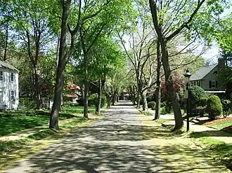 Auburndale is a village and neighborhood in northwestern Newton, Massachusetts. Brae Burn and Windermere Roads are located on the southeastern part of the neighborhood, bounded on the north by Greenough Road, on the south and west by Commonwealth Avenue (Massachusetts Route 30), and on the east by Arapahoe Road. Brae Burn Road runs roughly north-south between Greenough and Commonwealth, and Windermere runs north from Commonwealth before bending west to end at Brae Burn Road. These roads were laid out in 1911, in a period of renewed growth following an economic downturn.[2]