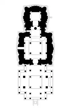 According to the art historian Adam Hardy, the temple illustrates the "Later Chalukya architecture, mainstream Lakkundi school of mid-11th century with late 11th century superstructure (shikhara)".[11] The temple has single shrine (ekakuta) connected to a closed mantapa hall via a vestibule (sukanasi or ardhamantapa) that is connected to another, open mantapa.[12] This temple is one of the fine illustrations of the Western Chalukya architecture.[13][14] The temple has a garbhagriha, an antarala, a closed navaranga mandapa, and an open pillared mukha-mandapa. Over the garbhagriha is the three storeyed nirandhara vimana with a square griva and sikhara.[9] Above the cornice of these arched niches at regular intervals is a seated Jaina figure. The ceilings are plain and pillars are well decorated. The open mandapa is supported by 32 pillars and pilasters.[3]