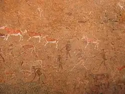 The Brandberg is a spiritual site of great significance to the San (Bushman) tribes. The main tourist attraction is The White Lady rock painting, located on a rock face with other art work, under a small rock overhang, in the Tsisab Ravine at the foot of the mountain. The ravine contains more than 1000 rock shelters, as well as more than 45000 rock paintings.[7]