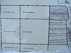 Brandywine Creek and the "bridal veil" cascades began about 10,000 years ago after the last glacial retreat. The falls have now exposed the harder, yellow-brown Berea sandstone looming over the softer, deep red Bedford Shale. Since sandstone is more resistant to erosion, the shale below is frequently undercut. As these layers wear away, the story of the earth continues to be revealed.