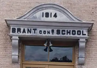 The exterior of the building is brick veneer, built on a wood frame. The original roof was wood shingle material, with a brick chimney extending up and over the hip style roof line. Shallow brick arches give the windows a slightly round top, local field stone and mortar are used in the foundation and basement. On the tower, over the school's main entrance is a corrugated tin canopy sign reading: "Brant Cons School 1914"