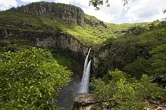 The terrain is an undulating plateau with geological formations of quartzites and limestones. It has many caves and several springs. Apart from the springs, the source of water supply to the park is also through a reservoir.[3] The most prominent features of the park are the pools formed from water wells. Several creeks flow through the park, including the Bananal, Torto, and Santa Maria Creeks. Because of the large number of springs, its nickname is Agua Mineral (mineral water); the water is reported to have healing properties.[5] There are many trekking trails through the park.[6]