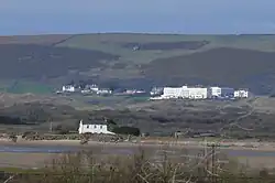 The South West Coast Path National Trail passes through the village and gives access for walkers to the spectacular North Devon coast. The Tarka Trail also passes through the village. Braunton Burrows marsh on the west side of the parish is a designated biosphere reserve, the first place in Great Britain to have gained such status.[7] The coastal part of the parish lies within the North Devon Coast Area of Outstanding Natural Beauty, and comprises Saunton Sands to the west, a beach of finely-grained sand, and to the south the estuary of the River Taw, of mixed mud and sand. The north of Braunton Burrows are open to light public access and have been converted into a Links Golf Course. Braunton was half-surrounded by an extensive brackish salt-water marsh restricting available agricultural land. In 1808 this was surveyed by Charles Vancouver, for the Board of Agriculture, who recommended that the marsh should be enclosed and reclaimed. This met with local approval and James Green was appointed as engineer for the drainage scheme. An Act of Parliament was obtained for the purpose on 25 May 1811.[n 1] On completion, responsibility for the marsh passed Marsh Inspectors, who sanctioned further work in 1854, involving the straightening and embanking of the River Caen, or Braunton Pill, to form the Braunton Canal. The scheme was completed by the addition of a new quay at Velator in the 1870s.[8]