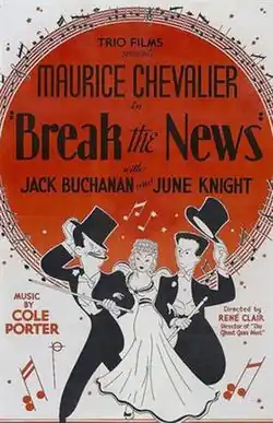 Break the News is a 1938 British musical comedy film directed by René Clair and starring Jack Buchanan, Maurice Chevalier and June Knight.[2] Two struggling performers decide to create a fake murder scandal in order to drum up publicity for their act. It was based on the novel Le mort en fuite by Loïc Le Gouriadec which had previously been made into a 1936 French film Death on the Run. Songs featured include It All Belongs to You (Cole Porter, sung by Chevalier) and We're Old Buddies (Van Phillips, Jack Buchanan, sung by Chevalier and Buchanan).[3]