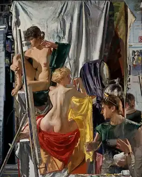 Breaking the Pose – alternately titled Breaking the Pose (The Art Class) [1]: Color Plate 18 – is an oil painting from 1986 by the painter Jerome Witkin. Completed when the artist was 47 and working as a professor at Syracuse University, the work demonstrates why Witkin has been called one of the greatest contemporary artists of his time[2] and one of today's great narrative painters.[3]