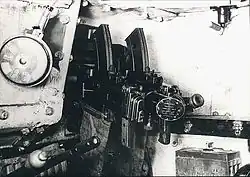 It was also adapted for use as an infantry machine gun.[2] For this purpose the gun was mounted on a machine-gun tripod by means of an adapter, and was fitted with a temporary rear sight on the right of the body and a temporary front sight on the right of the barrel at the muzzle. The temporary open sights took the place of the optical sight used when the gun was tank-mounted.