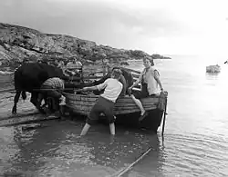 Chamberlain on a boat transporting cattle, during a pilgrimage to Bardsey Island in 1950. Photograph by Geoff Charles.