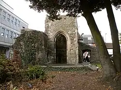 The borough was on a crossroads, where the Roman road from Colchester to London crossed the route the pilgrims took over the River Thames to Canterbury. A chapel was built in or around 1221, and in 1227 a market charter was granted. Its growth may have been stimulated by the cult of St. Thomas the Martyr, to whom the chapel was dedicated: the 13th-century ruin of Thomas Becket Chapel was a popular stopping point for pilgrims on their way to Canterbury. The ruin stands in the centre of the high street and the nearby parish church of Brentwood, built in the 1880s, retains the dedication to St. Thomas of Canterbury.[4][5] Pilgrims Hatch, or 'Pilgrims' gate', was probably named from pilgrims who crossed through on their way to the chapel. It is likely, however, that Brentwood's development was due chiefly to its main road position, its market, and its convenient location as an administrative centre. Early industries were connected mainly with textile and garment making, brewing, and brickmaking.[6]