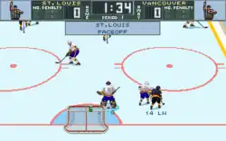 More than 600 authentic hockey players are used for this simulation game. Athletes are rated in skills related to skating, offense, defense, and goaltending skills.[6] The "coach mode" allows players to customize the team in order to meet their gaming needs.[6] There is an NHLPA license in the game but no NHL license; so that teams are only mentioned by city name.[6] The Super NES version only has a password save method instead of a battery backup method due to memory limitations.[6]