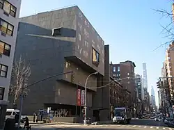 The site was formerly occupied by six 1880s rowhouses like those that surround it;[10] they had been demolished before the museum purchased the property.[11] The site was an elegant residential area before World War II; after the war, the area took on new luxury apartments and art dealers, becoming the "gallery center of New York".[12] It became an upscale commercial area by the mid-2010s, surrounded by retail shops for global fashion brands, luxury condominiums, and a large Apple Store. The 21st century site changes are partially attributed to development spurred by the Met Breuer's opening in 2016.[13]