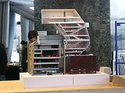 The building originally had 76,830 sq ft (7,138 m2) of interior space.[5] As first designed, the building had a lobby, coatroom, small gallery, and loading dock on its first floor. The second, third, and fourth floors were dedicated to gallery space, each progressively larger than the space beneath it. Administrative offices were on the fifth floor, and a large mechanical penthouse acted as the sixth floor. The lower floors were designed for a sculpture gallery and courtyard, a kitchen and dining space, and storage.[5][8] Only about one-third of the building was used as exhibition space;[42][43] sources disagree on whether the exhibits covered about 30,000 square feet (2,800 m2)[7][44] or 33,000 square feet (3,100 m2).[43] The remainder was for offices, storage, meeting rooms, a library, a restoration laboratory, stairs, elevators, and other spaces.[44]
