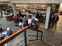 The basement is accessed by the stair at the lobby's southwest corner. The western wall of the basement is made of glass and connects with the areaway. The basement has bush-hammered concrete walls, slate floors, and a ceiling with circular lights, much like the rest of the lobby.[50] The Breuer Building's lower-level dining space has hosted numerous tenants. At its opening, the building had a cafeteria-style restaurant.[51] By the 1980s, the space was called the Garden Restaurant, the same name used for the restaurant in the museum's prior space beside the Abby Aldrich Rockefeller Sculpture Garden.[52][53] The restaurant hired a new manager and offered an English tea service, mushroom omelets, spicy pasta, and a layered "Whitney Cake".[53]