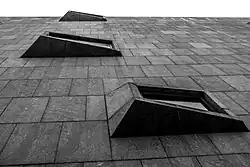 The west side of the lower level and ground floor is almost fully faced in glass.[8] Besides this, the building is predominantly windowless.[5][10] The majority of the upper-floor windows are decorative and are meant to prevent claustrophobia.[29][10] These trapezoidal windows jut out from the exterior walls and visually appear to have been placed at random.[10] The windows are set at angles from 20 to 25 degrees, pointed away from the path of the sun to avoid direct light from entering the building.[39][12] The Madison Avenue elevation of the facade has only a single window of this design, an oversized cyclopean pane angled to the north.[30][40] There are six such windows spread across the 75th Street elevation, all of which are tilted toward the west.[30]