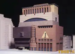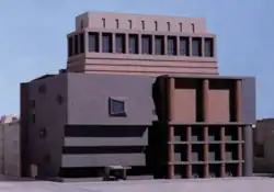In 1978, the Whitney's trustees considered a 35-story tower expansion to the building's south, amid plans for MoMA's museum-condominium "Museum Tower". The plan would let Italian developers create a luxury mixed-use tower with Whitney galleries on its lower floors. The proposed high-tech design was created by the British Norman Foster Associates and Derek Walker Associates.[103] The project was cancelled when it was pointed out that height restrictions would make the mixed-use development unprofitable.[104] The next expansion proposal was by Michael Graves, first announced in 1981, three months after Breuer's death. The first proposal came in May 1985, revised in 1987 and 1988. Graves' postmodern additions were heavily condemned for their bulk and for not harmonizing with the existing building.[105]