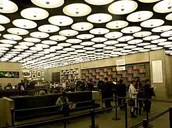 The ceiling is taken up by white circular light fixtures, each with a single bare silver-tipped bulb.[7][46][14] The interior is rich in materials – granite, wood, bronze, and leather, though muted in color.[14] Concrete walls in the lobby are bush-hammered, and framed by smooth boardformed edges;[23][47] the Met's contemporary art chair noted this as a delightful attention to detail.[23] The lobby, renovated extensively in preparation for the Met Breuer's opening, had an unoriginal gift shop structure removed, and its walls and sculptural ceiling lights were repaired. After the Met Breuer opened, the lobby featured a 32-foot-long (9.8 m) matte black LED media wall, a television screen, exhibitions, and other information.[23] Following Sotheby's renovation of the building in the 2020s, some lobby furniture was converted to display cases and cabinets.[48][49]