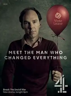 Brexit: The Uncivil War (simply Brexit in the US) is a 2019 British drama television film written by James Graham and directed by Toby Haynes.[3] It depicts the lead-up to the 2016 referendum through the activities of the strategists behind the Vote Leave campaign, that prompted the United Kingdom to exit the European Union, known as Brexit.[4] Benedict Cumberbatch stars as Dominic Cummings, the Campaign Director of the officially designated Brexit-supporting group, Vote Leave. Rory Kinnear stars as Craig Oliver, one of the leaders of the officially designated Remain-supporting group, Britain Stronger in Europe.[5]