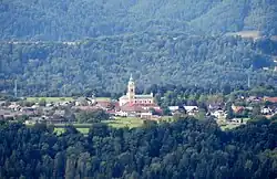 Brezje is best known for Mary Help of Christians Basilica (Slovene: Bazilika Marije Pomagaj), the largest pilgrimage church in Slovenia and national shrine of the Roman Catholic Archdiocese of Ljubljana. The present-day Neo-Renaissance church building modelled on the Basilica of Saint Mary of the Angels in Assisi was consecrated in 1900; it replaced Mary Help of Christians Chapel in the 15th century St Vitus parish church which had become a major pilgrimage site in the 19th century. Mary Help of Christians Basilica is also the monastery church of a Franciscan convent established at the site in 1898. The church plaza was laid out according to plans by Jože Plečnik.