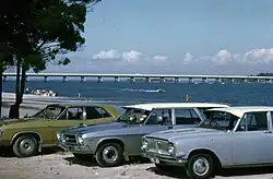In July 1961, construction on the bridge begun and piles were driven into the river bed. There were 206 (25 meters, 82 ft long) concrete piles installed for the bridge. At the centre of the bridge was a 7.3-meter (24 ft) clearance for small boats during low tide. On 19 October 1963, Bribie Island Bridge was opened by Queensland Premier Frank Nicklin, who also was the first person to pay for a toll, while the toll operator was Jack Greenhalgh. At the time, the bridge was one of the longest concrete bridges in Australia. The population of Bribie at the time was 500 residents, and the car ferry cost was an expensive price of 10 shillings. The bridge toll was $1 ($14.70 in today's money), which was considered expensive. This resulted in a public outrage, and the Celebrate Committee was disbanded. Despite the disappointment, in the first week, 14,000 cars paid the toll to cross the bridge. It was looked as if the opening event would be boycotted, however, a procession of floats, horse-drawn carts, vintage cars, marching bands, and large crowds drove over the bridge to the island for the first time.[1] Shortly afterwards, residents found out that the infrastructure and amenities such as parking, toilets and street signage were inadequate, and not up to expectations. Because of these factors, residents commonly demanded concessions and reductions. Shortly afterwards, the bridge earned the nickname, the “Ned Kelly Bridge” as it was felt as a highway robbery.[5]