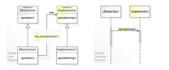 shows the run-time interactions: The Abstraction1 object delegates implementation to the Implementor1 object (by calling operationImp() on Implementor1),