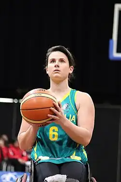 She made her national team debut in 2007 when she competed in the IWBF Qualification tournament.[5] She was selected to represent Australia at the 2009 Four Nations tournament in Canada, one of six players who played for the Dandenong Rangers in the WNWBL.[22] In July 2010, she played in a three-game test series against Germany.[23] In 2010, she was a member of the team that played in the Osaka Cup.[24] She represented Australia at the 2010 World Championships where her team finished fourth.[3] She came out of retirement in May 2024 to help the Gliders to qualify for the 2024 Summer Paralympics. The team failed to qualify.[8]