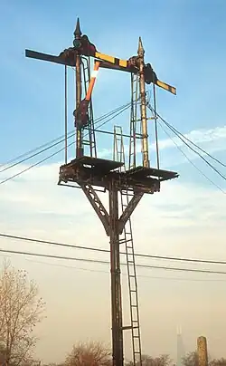 By the early 20th century, the Brighton Park crossing comprised tracks belonging to the Baltimore and Ohio Chicago Terminal Railroad; the Chicago Junction Railroad, eventually controlled by the New York Central Railroad as the Chicago River and Indiana; and the Pittsburgh, Cincinnati, Chicago and St. Louis Railroad, commonly known as the "Panhandle Route", which was controlled by the Pennsylvania Railroad (PRR) running north to south and crossing the Chicago and Alton main line running east to west.[3] The PCC&StL was the first railroad to cross the C&A at Brighton Park in the 1860s and therefore was responsible for arranging the safe crossing of trains. As other railroads built along the Panhandle right of way, this arrangement remained in effect with the responsibility passing to the PRR.